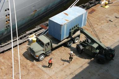 | Keywords: US Navy 100808-N-2888Q-005 Sailors transfer a container box lowered by crane from USNS Pomeroy (T-AKR 316) to a flatbed truck for transport.jpg en NEWPORT NEWS Va Aug 8 2010 Sailors assigned to Navy Cargo Handling Battalion NCHB 4 transfer a container box lowered by crane from the Military Sealift Command medium-speed roll-on/roll-off ship USNS Pomeroy T-AKR 316 to a flatbed truck for transport NCHB-4 is conducting cargo handling exercises as part of unit level training readiness assessment ULTRA Aug 5-8 U S Navy photo by Chief Mass Communication Specialist Lucy M Quinn/Released 2010-08-08 100808-N-2888Q-005 Navy http //www navy mil/view_image asp id 90211 U S Navy photo by Chief Mass Communication Specialist Lucy M Quinn PD-USGov-Military-Navy US Military containers Images from US Navy location Newport News Virginia Shipping container rigid trucks USNS Pomeroy T-AKR-316 |