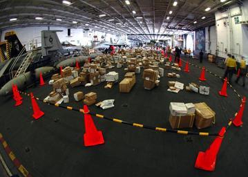 | Keywords: US Navy 100809-N-7103C-004 More than 30,000 pounds of mail is arranged for sorting in the hangar bay of the aircraft carrier USS George Washington (CVN 73) after an extended delay in the delivery of parcels while in South Korea.jpg en PACIFIC OCEAN Aug 9 2010 More than 30 000 pounds of mail is arranged for sorting in the hangar bay of the aircraft carrier USS George Washington CVN 73 after an extended delay in the delivery of parcels while in South Korea The ship's post office receives approximately 1 000 to 2 000 pounds of mail each day George Washington the Navy's only permanently forward-deployed aircraft carrier is underway helping to ensure security and stability in the western Pacific Ocean U S Navy photo by Mass Communication Specialist 3rd Class David A Cox/Released 2010-08-09 100809-N-7103C-004 Navy http //www navy mil/view_image asp id 90163 U S Navy photo by Mass Communication Specialist 3rd Class David A Cox PD-USGov-Military-Navy Aboard USS George Washington CVN-73 Postal Clerk United States Navy |