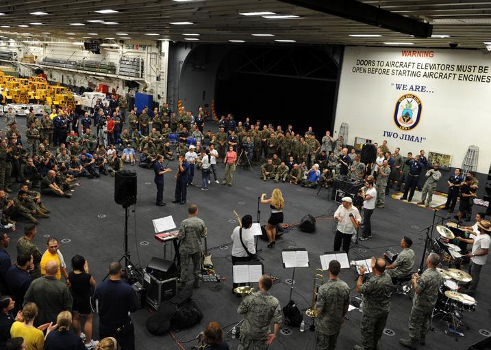 Keywords: US Navy 100809-N-4153W-342 Latin singer Carolina La O and the U.S. Air Force band, Nueva Armonia, entertain Sailors, Soldiers and Marines in the hangar bay of the multipurpose amphibious assault ship USS Iwo Jima (LHD 7).jpg en COVENAS Colombia Aug 10 2010 Latin singer Carolina La O and the U S Air Force band Nueva Armonia entertain Sailors Soldiers and Marines in the hangar bay of the multipurpose amphibious assault ship USS Iwo Jima LHD 7 Iwo Jima is operating off the coast of Colombia supporting Continuing Promise a four-month humanitarian and civic assistance mission through Latin America and the Caribbean U S Navy photo by Mass Communication Specialist 2nd Class Bryan Weyers/Released 2010-08-10 100809-N-4153W-342 Navy http //www navy mil/view_image asp id 90151 U S Navy photo by Mass Communication Specialist 2nd Class Bryan Weyers PD-USGov-Military-Navy Aboard USS Iwo Jima LHD-7 Military bands of the United States Air Force Carolina La O |