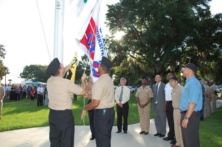 Keywords: US Navy 100818-N-3436L-002 Sailors raise the new Occupational Safety and Health Administration (OSHA) flag for achieving OSHA's Voluntary Protection Program.jpg en JACKSONVILLE Fla Aug 18 2010 Sailors assigned to Naval Air Station Jacksonville NAS Jax raise the new Occupational Safety and Health Administration OSHA flag for achieving OSHA's Voluntary Protection Program Star status during a ceremony at NAS Jax Looking on are OSHA Representative Jeffrey Romeo right Capt Jeffrey Maclay commanding officer of NAS Jax; NAS Jax Union Representative Robert Winchester; Bruce Cwalina executive director of Commander Navy Region Southeast; Rear Adm Arthur Johnson commander of Naval Safety Center and Ron Williamson NAS Jax safety officer U S Navy photo by Kaylee LaRocque/Released 2010-08-18 100818-N-3436L-002 Navy http //www navy mil/view_image asp id 90646 U S Navy photo by Kaylee LaRocque PD-USGov-Military-Navy Images from US Navy location Jacksonville Florida |