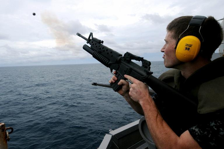 MAKE A MEME View Large Image Navy 100926-N-7680E-410 Gunner's Mate 3rd Class Andrey Murry, from Hickory, N.C., fires a grenade from an M203 grenade launcher during a live-fi.jpg en CARIBBEAN SEA Sept 26 2010 Gunner's Mate 3rd Class Andrey Murry from Hickory N C fires a ...