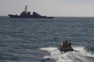 | Keywords: US Navy 100929-N-2855B-067 A rigid-hull inflatable boat peeds toward SS Stout (DDG 55) during maritime interdiction operations training.jpg en IRISH SEA Sept 29 2010 A rigid-hull inflatable boat RHIB from the guided-missile destroyer USS Bainbridge DDG 96 speeds toward the guided-missile destroyer USS Stout DDG 55 during maritime interdiction operations training Bainbridge and Stout are preparing to participate in Joint Warrior 10-2 a multinational exercise designed to improve interoperability between allied navies and prepare participating crews to conduct combined operations during deployment U S Navy photo by Mass Communication Specialist 1st Class Molly A Burgess/Released 2010-09-29 100929-N-2855B-067 Navy http //www navy mil/view_image asp id 92284 U S Navy photo by Mass Communication Specialist 1st Class Molly A Burgess PD-USGov-Military-Navy USS Bainbridge DDG-96 Joint Warrior 10-2 |