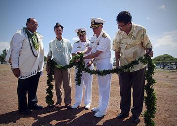 | Keywords: US Navy 101005-N-0995C-032 Capt. John Coronado, along with Capt. Rick Kitchens, untie the Maile Lei at the Ford Island Child Development Center gr.jpg en FORD ISLAND Hawaii Oct 5 2010 Capt John Coronado commander of Naval Facilities Engineering Command NAVFAC Hawaii along with Capt Rick Kitchens commander of Joint Base Pearl Harbor-Hickam untie the Maile Lei at the Ford Island Child Development Center groundbreaking ceremony The CDC is scheduled to be completed by Jan 2012 U S Navy photo by Mass Communication Specialist 2nd Class Eric J Cutright/Released 2010-10-05 101005-N-0995C-032 Navy http //www navy mil/view_image asp id 92449 U S Navy photo by Mass Communication Specialist 2nd Class Eric J Cutright PD-USGov-Military-Navy Ford Island People wearing leis |