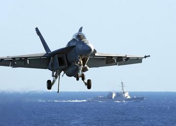 | Keywords: US Navy 101007-N-5082P-002 An F-A-18F Super Hornet assigned to the Red Rippers of Strike Fighter Squadron (VFA) 11 prepares to make an arrested lan.jpg en ATLANTIC OCEAN Oct 7 2010 An F/A-18F Super Hornet assigned to the Red Rippers of Strike Fighter Squadron VFA 11 prepares to make an arrested landing aboard the aircraft carrier USS Enterprise CVN 65 while the guided-missile destroyer USS Forest Sherman DDG 98 passes the port side during a training exercise The Enterprise Carrier Strike Group is conducting a Composite Training Unit Exercise in preparation for an upcoming deployment U S Navy Photo by Mass Communication Specialist 3rd Class Brooks B Patton/Released 2010-10-07 101007-N-5082P-002 Navy http //www navy mil/view_image asp id 92566 U S Navy Photo by Mass Communication Specialist 3rd Class Brooks B Patton PD-USGov-Military-Navy F/A-18F Super Hornet in flight Strike Fighter Squadron 11 United States Navy USS Enterprise CVN-65 flight deck |