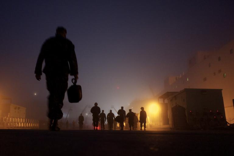 Keywords: US Navy 101118-N-9643K-771 Sailors assigned to the amphibious assault ship USS Bonhomme Richard (LHD 6) walk through early morning fog to the ship.jpg en SAN DIEGO Nov 18 2010 Sailors assigned to the amphibious assault ship USS Bonhomme Richard LHD 6 walk through early morning fog to the ship and the messing and berthing barge Bonhomme Richard is preparing for a dry-dock maintenance availability period starting in December U S Navy photo by Chief Mass Communication Specialist Joe Kane/Released 2010-11-18 101118-N-9643K-771 Navy http //www navy mil/view_image asp id 94328 U S Navy photo by Chief Mass Communication Specialist Joe Kane PD-USGov-Military-Navy Aboard USS Bonhomme Richard LHD-6 Photographs by Joseph Kane |