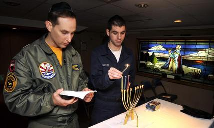 | Keywords: US Navy 101203-N-7103C-028 Yeoman Seaman Kevin Tucker, from Quaker Town, Penn., lights the Menorah during the third day of Hanukkah while Lt. Cmdr.jpg en WATERS WEST OF KOREAN PENINSULA Dec 3 2010 Yeoman Seaman Kevin Tucker from Quaker Town Penn lights the Menorah during the third day of Hanukkah while Lt Cmdr Ryan Hayes from San Diego reads a Jewish scripture in the chapel aboard the aircraft carrier USS George Washington CVN 73 U S Navy photo by Mass Communication Specialist 3rd Class David A Cox/Released 2010-12-03 101203-N-7103C-028 Navy http //www navy mil/view_image asp id 94897 U S Navy photo by Mass Communication Specialist 3rd Class David A Cox PD-USGov-Military-Navy USS George Washington CVN-73 chapel People lighting a Hanukiah Hanukkah in the military of the United States |