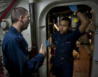 | Keywords: US Navy 101213-N-7981E-224 Hull Technician Fireman Jesseca Crosby discusses waste processing room hours and trash receiving policies with a Sailor.jpg en PACIFIC OCEAN Dec 13 2010 Hull Technician Fireman Jesseca Crosby discusses waste processing room hours and trash receiving policies with a Sailor aboard the aircraft carrier USS Carl Vinson CVN 70 Carl Vinson and Carrier Air Wing CVW 17 are on a three-week composite training unit exercise followed by a western Pacific deployment U S Navy photo by Mass Communication Specialist 2nd Class James R Evans/Released 2010-12-13 101213-N-7981E-224 Navy http //www navy mil/view_image asp id 95366 U S Navy photo by Mass Communication Specialist 2nd Class James R Evans PD-USGov-Military-Navy Aboard USS Carl Vinson CVN-70 |