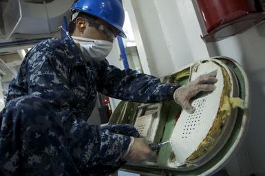 | Keywords: US Navy 110127-N-9643K-396 A Sailor assigned to the amphibious assault ship USS Bonhomme Richard (LHD 6) removes lagging from an airtight door.jpg en SAN DIEGO Jan 27 2011 A Sailor assigned to the amphibious assault ship USS Bonhomme Richard LHD 6 removes lagging from an airtight door Bonhomme Richard is in the National Steel and Shipbuilding Company dry-dock for maintenance and upgrades through April 2011 U S Navy photo by Chief Mass Communication Specialist Joe Kane/Released 2011-01-27 110127-N-9643K-396 Navy http //www navy mil/view_image asp id 97074 U S Navy photo by Chief Mass Communication Specialist Joe Kane PD-USGov-Military-Navy Aboard USS Bonhomme Richard LHD-6 Photographs by Joseph Kane |