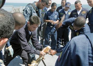| Keywords: US Navy 110203-A-5566B-011 A Colombian coast guardsman hammers a wedge into a pipe during a soft patch pipe repair class aboard the Whidbey Island.jpg en COVENAS Colombia Feb 3 2011 A Colombian coast guardsman hammers a wedge into a pipe during a soft patch pipe repair class aboard the Whidbey Island-class amphibious dock landing ship USS Gunston Hall LSD 44 The subject matter expert exchange was part of the Amphibious Southern Partnership SPS 2011 SPS is an annual deployment of U S ships to the U S Southern Command area of responsibility in the Caribbean and Latin America U S Army photo by Spc Gavriel Bar-Tzur/Released 2011-02-03 110203-A-5566B-011 Navy http //www navy mil/view_image asp id 97283 U S Army photo by Spc Gavriel Bar-Tzur PD-USGov-Military-Navy Aboard USS Gunston Hall LSD-44 |
