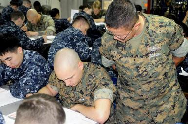 | Keywords: US Navy 110310-N-4920H-036 Hospital Corpsman Chief Thomas Tran checks the progress of Hospital Corpsman 3rd Class Emilio Casenave during the E-5 ex.jpg en SOUTH CHINA SEA March 10 2011 Hospital Corpsman Chief Thomas Tran checks the progress of Hospital Corpsman 3rd Class Emilio Casenave during the E-5 exam aboard the forward-deployed amphibious assault ship USS Essex LHD 2 Essex is part of the Essex Amphibious Ready Group on patrol in the western Pacific Ocean U S Navy photo by Mass Communication Specialist 1st Class Johnie Hickmon/Released 2011-03-10 110310-N-4920H-036 Navy http //www navy mil/view_image asp id 98274 U S Navy photo by Mass Communication Specialist 1st Class Johnie Hickmon PD-USGov-Military-Navy Aboard USS Essex LHD-2 Hospital Corpsman |
