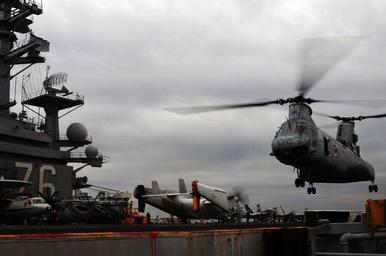 | Keywords: US Navy 110321-N-5503T-301 A CH-46E Sea Knight helicopter lifts off the flight deck of the aircraft carrier USS Ronald Reagan (CVN 76).jpg en PACIFIC OCEAN March 21 2011 A CH-46E Sea Knight helicopter assigned to the Flying Tigers of Marine Medium Helicopter Squadron HMM 262 Marine Aircraft Group MAG 36 1st Marine Aircraft Wing 1st MAW lifts off the flight deck of the aircraft carrier USS Ronald Reagan CVN 76 Ronald Reagan is operating off the coast of Japan providing humanitarian assistance as directed in support of Operation Tomodachi U S Navy photo by Mass Communication Specialist 3rd Class Alexander Tidd/Released 2011-03-21 110321-N-5503T-301 Navy http //www navy mil/view_image asp id 98867 U S Navy photo by Mass Communication Specialist 3rd Class Alexander Tidd PD-USGov-Military-Navy USS Ronald Reagan CVN-76 humanitarian aid Operation Tomodachi in March 2011 Marine Medium Helicopter Squadron 262 CH-46 US Marine Corps Helicopters at USS Ronald Reagan CVN-76 |