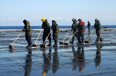 | Keywords: US Navy 110323-N-NB544-194 Sailors scrub the flight deck aboard the aircraft carrier USS Ronald Reagan (CVN 76) following a countermeasure wash dow.jpg en PACIFIC OCEAN March 23 2011 Sailors scrub the flight deck aboard the aircraft carrier USS Ronald Reagan CVN 76 following a countermeasure wash down to decontaminate the flight deck while the ship is operating off the coast of Japan Sailors scrubbed the external surfaces on the flight deck and island superstructure to remove potential radiation contamination Ronald Reagan is operating off the coast of Japan providing humanitarian assistance as directed in support of Operation Tomodachi U S Navy photo by Mass Communication Specialist 3rd Class Kyle Carlstrom/Released 2011-03-23 110323-N-NB544-194 Navy http //www navy mil/view_image asp id 98895 U S Navy photo by Mass Communication Specialist 3rd Class Kyle Carlstrom PD-USGov-Military-Navy Radiation decontamination of the USS Ronald Reagan |