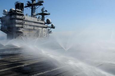 | Keywords: US Navy 110323-N-NB544-120 The aircraft carrier USS Ronald Reagan (CVN 76) conducts a countermeasure wash down to decontaminate the flight deck whi.jpg en PACIFIC OCEAN March 23 2011 The aircraft carrier USS Ronald Reagan CVN 76 conducts a countermeasure wash down to decontaminate the flight deck while the ship is operating off the coast of Japan Sailors scrubbed the external surfaces on the flight deck and island superstructure to remove potential radiation contamination Ronald Reagan is operating off the coast of Japan providing humanitarian assistance as directed in support of Operation Tomodachi U S Navy photo by Mass Communication Specialist 3rd Class Kyle Carlstrom/Released 2011-03-23 110323-N-NB544-120 Navy http //www navy mil/view_image asp id 98893 U S Navy photo by Mass Communication Specialist 3rd Class Kyle Carlstrom PD-USGov-Military-Navy Radiation decontamination of the USS Ronald Reagan |