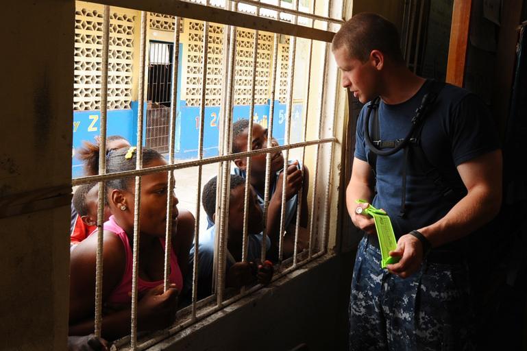 Keywords: US Navy 110421-F-CF975-145 Aviation Electrician's Mate Airman Joshua Schell, from Baltimore, talks to neighborhood children during a Continuing Pro.jpg en KINGSTON Jamaica April 21 2011 Aviation Electrician's Mate Airman Joshua Schell from Baltimore talks to neighborhood children during a Continuing Promise 2011 community service project Continuing Promise is a five-month humanitarian assistance mission to the Caribbean Central and South America U S Air Force photo by Senior Airman Kasey Close/Released 2011-04-21 110421-F-CF975-145 Navy http //www navy mil/view_image asp id 100186 U S Air Force photo by Senior Airman Kasey Close PD-USGov-Military-Navy United States Navy in Kingston Jamaica