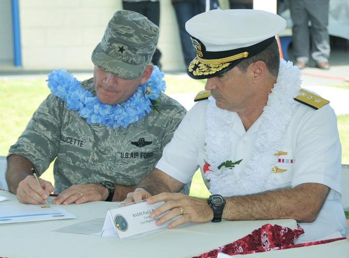 | Keywords: US Navy 110513-N-8185D-010 Brig. Gen. John Doucette and Rear Adm. Paul Bushong sigh a charter with Guam.jpg en TUMON Guam May 13 2011 Brig Gen John Doucette left Commander of the U S Air Force 36th Wing and deputy commander of Joint Region Marianas and Rear Adm Paul Bushong commander of Joint Region Marianas sign the Partnering Charter Agreement to renew the military's traffic safety partnership with the Government of Guam during a signing ceremony at the Guam Department of Public Works Department of Highway Safety office The proclamation signed by Lt Gov Ray Tenorio declared the week of May 15-21 Public Works Week and kicked off the Click it or Ticket Mobilization campaign which will be observed May 23-June 5 U S Navy photo by JoAnna Delfin/Released 2011-05-13 110513-N-8185D-010 Navy http //www navy mil/view_image asp id 101072 U S Navy photo by JoAnna Delfin PD-USGov-Military-Navy Images from US Navy location Tumon Guam Paul Bushong |