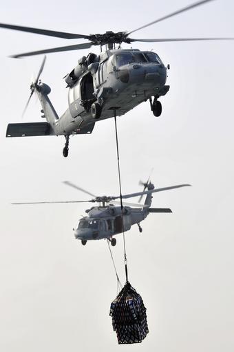 | Keywords: US Navy 110519-N-DM338-296 SH-60S Sea Hawk helicopters assigned to the Wild Cards of Helicopter Sea Combat Squadron (HSC) 23 transport pallets from.jpg en ARABIAN GULF May 19 2011 SH-60S Sea Hawk helicopters assigned to the Wild Cards of Helicopter Sea Combat Squadron HSC 23 transport pallets from the Military Sealift Command fast combat support ship USNS Bridge T-AOE 10 to the aircraft carrier USS Ronald Reagan CVN 76 during a replenishment at sea Ronald Reagan and Carrier Air Wing CVW 14 are deployed to the U S 5th Fleet area of responsibility and will be conducting close-air support missions as part of Operations Enduring Freedom and New Dawn U S Navy photo by Mass Communication Specialist Seaman Nicholas A Groesch/Released 2011-05-19 110519-N-DM338-296 Navy http //www navy mil/view_image asp id 101364 U S Navy photo by Mass Communication Specialist Seaman Nicholas A Groesch PD-USGov-Military-Navy USNS Bridge T-AOE-10 Helicopter Sea Combat Squadron 23 United States Navy |