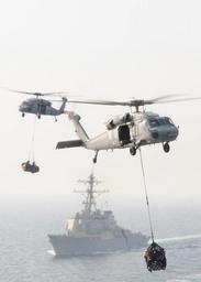 | Keywords: US Navy 110531-N-SG869-279 MH-60S Sea Hawk helicopters assigned to the Wild Cards of Helicopter Sea Combat Squadron (HSC) 23 transfer supplies from.jpg en ARABIAN GULF May 31 2011 MH-60S Sea Hawk helicopters assigned to the Wild Cards of Helicopter Sea Combat Squadron HSC 23 transfer supplies from the Military Sealift Command fast combat support ship USNS Bridge T-AOE 10 to the aircraft carrier USS Ronald Reagan CVN 76 during a replenishment at sea as the Arleigh Burke-class guided-missile destroyer USS Higgins DDG 76 prepares to come alongside Bridge Ronald Reagan and Carrier Air Wing CVW 14 are deployed to the U S 5th Fleet area of responsibility and are conducting close-air support missions as part of Operations Enduring Freedom and New Dawn U S Navy photo by Mass Communication Specialist 2nd Class Josh Cassatt/Released 2011-05-31 110531-N-SG869-279 Navy http //www navy mil/view_image asp id 101883 U S Navy photo by Mass Communication Specialist 2nd Class Josh Cassatt PD-USGov-Military-Navy USNS Bridge T-AOE-10 Helicopter Sea Combat Squadron 23 United States Navy |