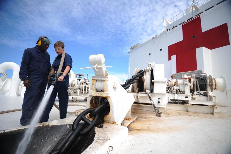 | Keywords: US Navy 110627-N-NY820-071 Civil service mariner Able Seaman Erwin Joiner and Lt. Erinn Gelakoska clean debris from the anchor chain as it is hoist.jpg en SAN JUAN DEL SUR Nicaragua June 27 2011 Civil service mariner Able Seaman Erwin Joiner and Lt Erinn Gelakoska clean debris from the anchor chain as it is hoisted aboard the Military Sealift Command hospital ship USNS Comfort T-AH 20 while preparing to depart San Juan del Sur during Continuing Promise 2011 Continuing Promise is a five-month humanitarian assistance mission to the Caribbean Central and South America U S Navy photo by Mass Communication Specialist 2nd Class Eric C Tretter/Released 2011-06-27 110627-N-NY820-071 Navy http //www navy mil/view_image asp id 103329 U S Navy photo by Mass Communication Specialist 2nd Class Eric C Tretter PD-USGov-Military-Navy Aboard USNS Comfort T-AH-20 |