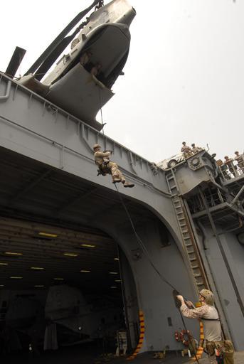 Keywords: US Navy 110702-N-DB458-037 Marines assigned to Force Reconnaissance, 13th Marine Expeditionary Unit (13th MEU), conduct rappel training.jpg en GULF OF ADEN July 2 2011 Marines assigned to Force Reconnaissance 13th Marine Expeditionary Unit 13th MEU conduct rappel training from the flight deck to an aircraft elevator aboard the amphibious assault ship USS Boxer LHD 4 Boxer and the 13th MEU are underway supporting maritime security operations and theater security cooperation efforts in the U S 5th Fleet area of responsibility U S Navy photo by Mass Communication Specialist 3rd Class Anna Kiner/Released 2011-07-02 110702-N-DB458-037 Navy http //www navy mil/view_image asp id 103971 U S Navy photo by Mass Communication Specialist 3rd Class Anna Kiner PD-USGov-Military-Navy Aboard USS Boxer LHD-4 |