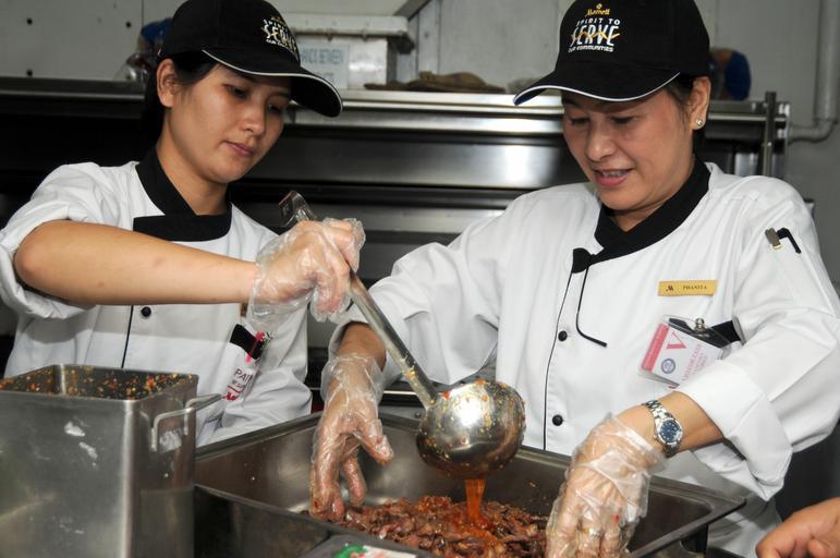 Keywords: US Navy 110809-N-JV466-008 Thai chefs, Ann Chetcharaporn and Jim Phanita, pour sauce over grilled meat during a cooking lesson for culinary special.jpg en THAILAND Aug 9 2011 Thai chefs Ann Chetcharaporn and Jim Phanita pour sauce over grilled meat during a cooking lesson for culinary specialists aboard the aircraft carrier USS George Washington CVN 73 George Washington is in Thailand for a port visit to strengthen ties with the partner nation U S Navy photo by Chief Mass Communication Specialist John Harrington/Released 2011-08-09 110809-N-JV466-008 Navy http //www navy mil/view_image asp id 105578 U S Navy photo by Chief Mass Communication Specialist John Harrington PD-USGov-Military-Navy Aboard USS George Washington CVN-73 |