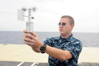 | Keywords: US Navy 110826-N-AU622-016 Aerographers Mate Airman John Abbott measures wind speed and direction with an anemometer on the bow of the aircraft car.jpg en ATLANTIC OCEAN Aug 26 2011 Aerographers Mate Airman John Abbott measures wind speed and direction with an anemometer on the bow of the aircraft carrier USS Dwight D Eisenhower CVN 69 Dwight D Eisenhower is underway as a precaution due to the approach of Hurricane Irene The storm made landfall near Cape Lookout N C as a Category 1 hurricane with sustained winds of 85 miles-per-hour U S Navy photo by Mass Communication Specialist 3rd Class Nathan Parde/Released 2011-08-26 110826-N-AU622-016 Navy http //www navy mil/view_image asp id 106393 U S Navy photo by Mass Communication Specialist 3rd Class Nathan Parde PD-USGov-Military-Navy Aboard USS Dwight D Eisenhower CVN-69 |