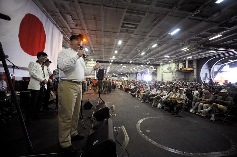 Keywords: US Navy 110827-N-IS680-030 Lt. Cmdr. Dave Hecht welcomes families and friends as USS George Washington (CVN 73) commences its friends and family da.jpg en YOKOSUKA Japan Aug 27 2011 Lt Cmdr Dave Hecht public affairs officer aboard the aircraft carrier USS George Washington CVN 73 welcomes families and friends as the ship commences its friends and family day cruise into Tokyo Bay The cruise allowed Sailors' families and friends to get a first-hand look at what life for their Sailor is like at sea U S Navy photo by Mass Communication Specialist Seaman Alysia R Hernandez/Released 2011-08-27 110827-N-IS680-030 Navy http //www navy mil/view_image asp id 106490 U S Navy photo by Mass Communication Specialist Seaman Alysia R Hernandez PD-USGov-Military-Navy Aboard USS George Washington CVN-73