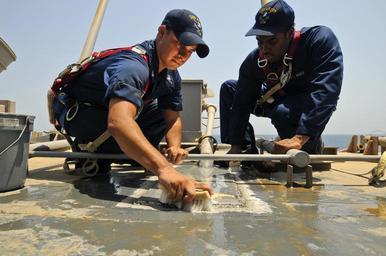 | Keywords: US Navy 110915-N-YM590-004 Quartermaster 3rd Class Michael Martinez, left, and Quartermaster 3rd Class Jamarcus Hardy clean the top of the bridge.jpg en GULF OF ADEN Sept 15 2011 Quartermaster 3rd Class Michael Martinez left and Quartermaster 3rd Class Jamarcus Hardy clean the top of the bridge aboard the guided-missile cruiser USS Anzio CG 68 Anzio is assigned to Combined Task Force 151 a multi-national mission-based task force established by the Combined Maritime Forces in January 2009 to conduct counter-piracy operations in the Red Sea Gulf of Aden Somali Basin and Arabian Sea U S Navy photo by Mass Communication Specialist 2nd Class Brian M Brooks/Released 2011-09-15 110915-N-YM590-004 Navy http //www navy mil/view_image asp id 107536 U S Navy photo by Mass Communication Specialist 2nd Class Brian M Brooks PD-USGov-Military-Navy USS Anzio CG-68 |