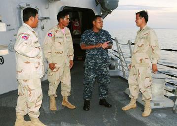 | Keywords: US Navy 111025-N-NJ145-002 Boatswain's Mate 2nd Class Suorth Suom, a Cambodian-American Sailor assigned to the guided-missile destroyer USS Kidd (D.jpg en GULF OF THAILAND Oct 25 2011 Boatswain's Mate 2nd Class Suorth Suom a Cambodian-American Sailor assigned to the guided-missile destroyer USS Kidd DDG 100 speaks with Royal Cambodian navy sailors during the at-sea phase of Cooperation Afloat Readiness and Training CARAT Cambodia 2011 The exercise marked the first time Suom had been to his ancestral homeland since his family fled civil war in Cambodia in 1979 CARAT is a series of bilateral exercises held annually in Southeast Asia to strengthen relationships and enhance force readiness U S Navy photo by Mass Communication Specialist 1st Class Robert Clowney/Released 2011-10-25 111025-N-NJ145-002 Navy http //www navy mil/view_image asp id 109517 U S Navy photo by Mass Communication Specialist 1st Class Robert Clowney PD-USGov-Military-Navy Aboard USS Kidd DDG-100 |