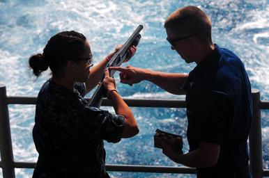 | Keywords: US Navy 111031-N-UO379-126 Gunner's Mate 3rd Class John Thurman, from Riverside, Calif., instructs Interior Communications Specialist 3rd Class Jes.jpg en PACIFIC OCEAN Oct 31 2011 Gunner's Mate 3rd Class John Thurman from Riverside Calif instructs Interior Communications Specialist 3rd Class Jessica Cuadrado from Newark N J on the proper firing technique of a Mossberg 500 shotgun on the fantail of the aircraft carrier USS Ronald Reagan CVN 76 during a weapons handling evolution Ronald Reagan is conducting routine training in the eastern Pacific Ocean Ronald Reagan is homeported in San Diego U S Navy photo by Mass Communication Specialist 3rd Class Alexander Tidd/Released 2011-10-31 111031-N-UO379-126 Navy http //www navy mil/view_image asp id 109866 U S Navy photo by Mass Communication Specialist 3rd Class Alexander Tidd PD-USGov-Military-Navy Firearms training on USS Ronald Reagan CVN-76 Mossberg 500 |