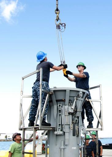 Keywords: US Navy 111109-N-BT122-470 Sailors connect an MK180 hook to a missile tube extension loader during a Naval Air Systems Command Tomahawk site certif.jpg en POLARIS POINT Guam Nov 9 2011 Gunner's Mate 2nd Class Lance McConnell and Machinist's Mate 2nd Class Jason Hefner both assigned to the submarine tender USS Frank Cable AS 40 connect an MK180 hook to a missile tube extension loader during a Naval Air Systems Command Tomahawk site certification Frank Cable conducts maintenance and support of submarines and surface vessels deployed in the U S 7th Fleet area of responsibility U S Navy photo by Mass Communication Specialist 1st Class Melvin Nobeza/Released 2011-11-09 111109-N-BT122-470 Navy http //www navy mil/view_image asp id 110055 U S Navy photo by Mass Communication Specialist 1st Class Melvin Nobeza PD-USGov-Military-Navy Aboard USS Frank Cable AS-40 |