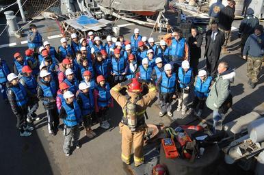 | Keywords: US Navy 111122-N-ZI955-177 Navy Diver 2nd Class Quentin Case, from Butte, Mont., explains how to properly wear shipboard firefighting gear during a.jpg en ONAGAWA Japan Nov 22 2011 Navy Diver 2nd Class Quentin Case from Butte Mont explains how to properly wear shipboard firefighting gear during a tour aboard the Military Sealift Command rescue and salvage ship USNS Safeguard T-ARS 50 While Safeguard is conducting a port visit to Onagawa the crew will assist with community service projects and conduct tours of the ship Onagawa was devastated by the Great East Japan Earthquake March 11 2011 which triggered a massive tsunami that swept through the area Safeguard is the first U S Navy ship to visit the area since Operation Tomodachi concluded U S Navy photo by Senior Chief Mass Communication Specialist Daniel Sanford/Released 2011-11-22 111122-N-ZI955-177 Navy http //www navy mil/view_image asp id 110886 U S Navy photo by Senior Chief Mass Communication Specialist Daniel Sanford PD-USGov-Military-Navy Aboard USNS Safeguard T-ARS-50 |
