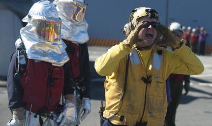 | Keywords: US Navy 111129-N-PB383-607 Aviation Boatswain's Mate 3rd Class Marcus Thornton calls for help during a fire drill on the flight deck of the amphibi.jpg en PACIFIC OCEAN Nov 29 2011 Aviation Boatswain's Mate 3rd Class Marcus Thornton calls for help during a fire drill on the flight deck of the amphibious transport dock ship USS New Orleans LPD 18 New Orleans and embarked Marines assigned to the 11th Marine Expeditionary Unit 11th MEU are conducting operations in the U S 7th fleet area of responsibility as part of the Makin Island Amphibious Ready Group U S Navy photo by Mass Communication Specialist 3rd Class Dominique Pineiro/Released 2011-11-29 111129-N-PB383-607 Navy http //www navy mil/view_image asp id 111092 U S Navy photo by Mass Communication Specialist 3rd Class Dominique Pineiro PD-USGov-Military-Navy Flight deck of USS New Orleans LPD-18 |