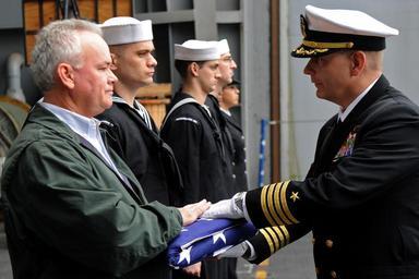 | Keywords: US Navy 111209-N-XE109-085 A Sailor presents the national ensign.jpg en ATLANTIC OCEAN Nov 15 2011 Capt Brian E Luther right the commanding officer of USS George H W Bush CVN 77 presents the national ensign to Robert Moye the son of retired Navy Cmdr William Moye during a burial at sea ceremony held aboard the aircraft carrier William Moye is one of 1 200 friends and family members of the crew participating in a Tiger Cruise at the end of the ship's first combat deployment U S Navy photo by Mass Communication Specialist Seaman Brian Read Castillo/Released 2011-11-15 111209-N-XE109-085 Navy http //www navy mil/view_image asp id 112001 U S Navy photo by Mass Communication Specialist Seaman Brian Read Castillo PD-USGov-Military-Navy Aboard USS George H W Bush CVN-77 Brian E Luther |