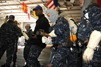 | Keywords: US Navy 111215-N-NZ569-067 Aviation Boatswain's Mate (Handling) 1st Class Delaine Young trains sailors on the proper way to handle the nozzle on a.jpg en NORFOLK Dec 15 2011 Aviation Boatswain's Mate Handling 1st Class Delaine Young trains sailors on the proper way to handle the nozzle on a fire hose aboard the aircraft carrier USS Dwight D Eisenhower CVN 69 during a general quarters drill Dwight D Eisenhower is moored at Naval Station Norfolk U S Navy photo by Mass Communication Specialist 3rd Class Tony Bloom/Released 2011-12-15 111215-N-NZ569-067 Navy http //www navy mil/view_image asp id 112454 U S Navy photo by Mass Communication Specialist 3rd Class Tony Bloom PD-USGov-Military-Navy Aboard USS Dwight D Eisenhower CVN-69 |