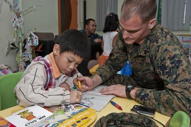 | Keywords: US Navy 111222-N-DX615-107 Sgt. Benjamin Wooden, assigned to the 11th Marine Expeditionary Unit (11th MEU), colors with a boy at Singapore's Child.jpg en SINGAPORE Dec 22 2011 Sgt Benjamin Wooden assigned to the 11th Marine Expeditionary Unit 11th MEU colors with a boy at Singapore's Child at Street 11 care center where Sailors and Marines from the amphibious assault ship USS Makin Island LHD 8 interacted with children at the care center as part of a community service project Makin Island is on its maiden deployment and conducting operations in the U S 7th Fleet area of responsibility in support of the Navy's maritime strategy Makin Island is the Navy's newest amphibious assault ship and the only U S Navy ship with a hybrid electric propulsion system U S Navy photo by Mass Communication Specialist 2nd Class Alan Gragg/Released 2011-12-22 111222-N-DX615-107 Navy http //www navy mil/view_image asp id 112701 U S Navy photo by Mass Communication Specialist 2nd Class Alan Gragg PD-USGov-Military-Navy USS Makin Island LHD-8 Child at Street 11 United States Marine Corps in Singapore 11th Marine Expeditionary Unit |