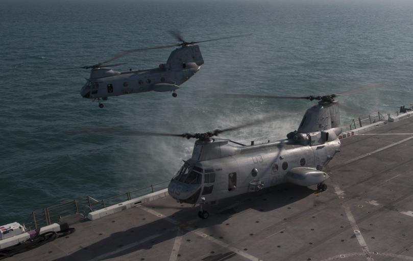 | Keywords: US Navy 120114-N-PB383-291 A helicopter takes off the flight deck.jpg en ARABIAN GULF Jan 14 2012 A CH-46E Sea Knight helicopter assigned to the Red Dragons of Marine Medium Helicopter Squadron 268 Reinforced takes off the flight deck of the amphibious transport dock ship USS New Orleans LPD 18 New Orleans and embarked Marines assigned to the 11th Marine Expeditionary Unit 11th MEU are deployed as part of the Makin Island Amphibious Ready Group supporting maritime security operations and theater security cooperation efforts in the U S 5th Fleet area of responsibility U S Navy photo by Mass Communication Specialist 2nd Class Dominique Pineiro/Released 2012-01-14 120114-N-PB383-291 Navy http //www navy mil/view_image asp id 113559 U S Navy photo by Mass Communication Specialist 2nd Class Dominique Pineiro PD-USGov-Military-Navy Flight deck of USS New Orleans LPD-18 CH-46 Sea Knight |