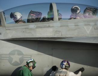 | Keywords: US Navy 120130-N-DR144-139 Pilots ready for launch in an F-A-18F Super Hornet assigned to Strike Fighter Squadron (VFA) 22 on the flight deck aboar.jpg en ARABIAN SEA Jan 30 2012 Maintenance personnel prepare the aircraft as Capt Jeffrey Winter left deputy commander of Carrier Air Wing CVW 17 and Cmdr Paul C Spedero the Nimitz-class aircraft carrier USS Carl Vinson's CVN 70 executive officer ready for launch in an F/A-18F Super Hornet assigned to Strike Fighter Squadron VFA 22 on the flight deck aboard Carl Vinson Carl Vinson and Carrier Air Wing CVW 17 are deployed to the U S 5th Fleet area of responsibility U S Navy photo by Mass Communication Specialist 2nd Class James R Evans/Released 2012-01-30 120130-N-DR144-139 Navy http //www navy mil/view_image asp id 114305 U S Navy photo by Mass Communication Specialist 2nd Class James R Evans PD-USGov-Military-Navy Images from US Navy ship USS Carl Vinson's CVN 70 |
