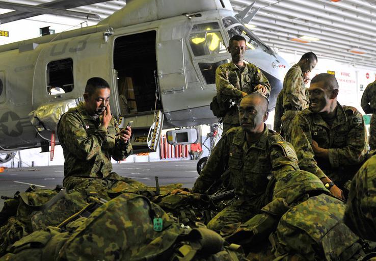 | Keywords: US Navy 120210-N-KB563-036 Members of the Japan Ground Self-Defense Force put on camouflage face paint before conducting a beach landing exercise w.jpg en PACIFIC OCEAN Feb 10 2012 Members of the Japan Ground Self-Defense Force put on camouflage face paint before conducting a beach landing exercise with Marines from the 15th Marine Expeditionary Unit 15th MEU aboard the amphibious assault ship USS Peleliu LHA 5 during Exercise Iron Fist 2012 Iron Fist is a training exercise between U S Marines and the Japan Ground Self-Defense Force designed to increase interoperability and amphibious capabilities throughout the U S 3rd and 7th Fleet areas of responsibility U S Navy photo by Mass Communication Specialist 2nd Class Michael Russell/Released 2012-02-10 120210-N-KB563-036 Navy http //www navy mil/view_image asp id 115538 U S Navy photo by Mass Communication Specialist 2nd Class Michael Russell PD-USGov-Military-Navy Aboard USS Peleliu LHA-5 People of the JGSDF |