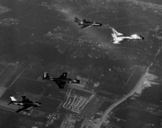 Keywords: US Navy aircraft from ATG-181 in flight 1955.jpeg Four U S Navy aircraft of Air Task Group 181 ATG-181 in flight probably over the Eastern United States on 29 September 1955 Visible are top to bottom <br> a Grumman F9F-6 Panther from Fighter Squadron VF-21 Mach Busters;<br> a Vought F7U-3M Cutlass from Attack Squadron VA-83 Sidewinders;<br> a McDonnell F2H-3 Banshee from VF-41 Black Aces;<br> and a North American FJ-3 Fury also from VF-21 which transitioned to the FJ-3 in late 1955 http //collections naval aviation museum/emuwebdoncoms/pages/doncoms/AdvQuery php U S Navy National Museum of Naval Aviation photo No http //collections naval aviation museum/emuwebdoncoms/pages/doncoms/Display php irn 29064 QueryPage 2Femuwebdoncoms 2Fpages 2Fdoncoms 2FAdvQuery php 1996 488 210 006 1955-09-29 U S Navy PD-USGov-Military-Navy Grumman F9F Cougar Vought F7U Cutlass McDonnell F2H-3 Banshee North American FJ-3 Fury Fighter Squadron 41 United States Navy Fighter Squadron 43 United States Navy Attack Squadron 83 United States Navy