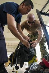 | Keywords: US Navy divers and Belizean Coast Guard divers work together during Southern Partnership Station '14 140611-N-IP743-138.jpg en Navy Diver 1st Class Jose Arbelaez of Mobile Diving and Salvage Unit Two MDSU 2 Company 2-1 and Petty Officer 2nd Class Abraham Hinds of the Belize Coast Guard Service attach a buoyancy compensator to a SCUBA tank The MDSU 2 divers are working together with their Belizean Coast Guard counterparts as part of Southern Partnership Station 2014 Southern Partnership Station 2014 is a U S Navy deployment focused on subject matter expert exchanges with partner nation militaries and security forces in Central and South America and the Caribbean U S military teams work with partner nation forces during naval-focused training exercises military-to-military engagements and community relations projects in an effort to enhance partnerships with regional maritime activities and improve the operational readiness of participants U S Navy photo by Mass Communication Specialist 1st Class Brett Cote/Released 2014-06-11 Petty Officer 1st Class Brett Cote https //www dvidshub net/image/1394658 140611-N-IP743-138 2014-06-12 21 20 BELIZE CITY BZ 3 PD-USGov-Military-Navy United States Navy Mobile Diving and Salvage Unit Two Southern Partnership Station 2014 Images from DoD uploaded by Fæ |