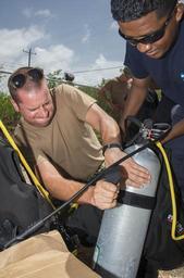 | Keywords: US Navy divers and Belizean Coast Guard divers work together during Southern Partnership Station '14. 140623-N-IP743-088.jpg en Navy Diver 1st Class Todd Verhagen of Mobile Diving and Salvage Unit Two MDSU 2 Company 2-1 and Petty Officer 3rd Class Abraham Hinds of the Belize Coast Guard Service attach a buoyancy compensator to a SCUBA tank The MDSU 2 divers are working together with their Belizean Coast Guard counterparts as part of Southern Partnership Station 2014 Southern Partnership Station 2014 is a U S Navy deployment focused on subject matter expert exchanges with partner nation militaries and security forces in Central and South America and the Caribbean U S military teams work with partner nation forces during naval-focused training exercises military-to-military engagements and community relations projects in an effort to enhance partnerships with regional maritime activities and improve the operational readiness of participants U S Navy photo by Mass Communication Specialist 1st Class Brett Cote/Released 2014-06-23 Petty Officer 1st Class Brett Cote https //www dvidshub net/image/1420081 140623-N-IP743-088 2014-06-25 21 22 BELIZE CITY BZ PD-USGov-Military-Navy United States Navy Mobile Diving and Salvage Unit Two Southern Partnership Station 2014 Images from DoD uploaded by Fæ |