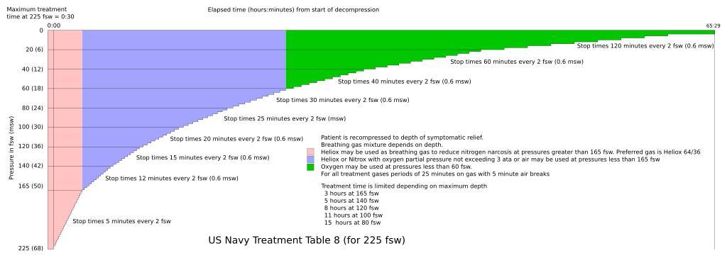 Keywords: US Navy Table 8 for 225fsw.svg en Graphic representation of US Navy Recompression Treatment Table 8 2015-11-11 own Pbsouthwood other versions cc-zero Decompression tables Uploaded with UploadWizard