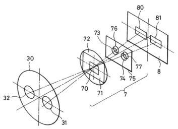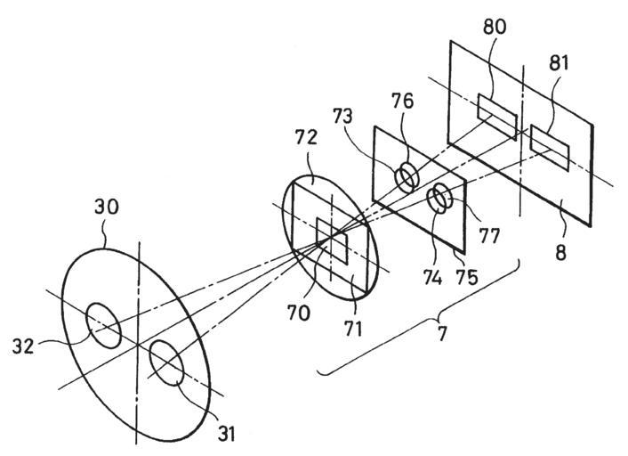 | Keywords: US pat 5589909 fig 2.png US patent 5589909 fig 2 phase detection system wikitable + Legend compiled from patent text 7 Optical system for focus detection - 8 Image sensor - 30 Plane of the vicinity of the exit pupil of the optical system for photography - 31 and 32 Pair of regions - 70 Window - 71 Visual field mask - 72 Condenser lens - 73 and 74 Pair of apertures - 75 Aperture mask - 76 and 77 Pair of reconverging lenses - 80 and 81 Pair of light receiving sections PD-USGov Autofocus diagrams |