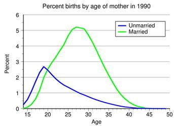 | Keywords: US percent of births by age of mother and marital status in 1990.svg translate yes en Percent of births by age of mother and marital status in the United States in 1990 The median age of unmarried mothers was 21 and 27 for married mothers 72 0 of births were to married mothers and 28 0 to unmarried mothers Data from https //nchs beyond2020 com/Vitalstats/ReportFolders/reportFolders aspx CDC 2016-05-15 own Delphi234 other versions Generated with Wikimedia SVG Chart SVG Chart/box cc-zero Childbirth graphs Demographics of the United States |