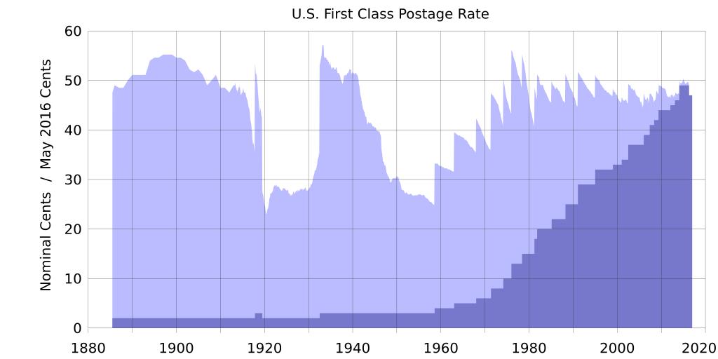 | Keywords: US Postage History.svg History of US postage 1885 - 2016 May 2016 inflation adjustment CPI Bureau of Labor Statistics ftp //ftp bls gov/pub/special requests/cpi/cpiai txt; pre-1913 http //oregonstate edu/Dept/pol_sci/fac/sahr/infcf16652005 pdf Rates en History of United States Postal Service rates See also Image US_first-class_postage_stamp_rates svg <math>Inflation\ Adjustment Postage \times \frac May\ 2016\ CPI CPI </math> en wikipedia 2007-06-23 Lalala666 wikipedia en Lalala666 original upload log page en wikipedia US_Postage_History svg 2007-06-23 18 57 Lalala666 800×400×0 76511 bytes History of US postage 1885 - 2007 Apr 07 inflation adjustment Political history of the United States Postal history of the United States United States Postal Service |