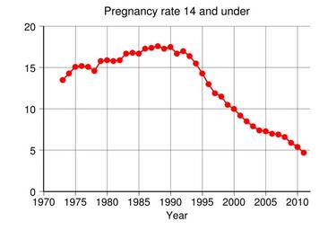 | Keywords: US Pregnancy Rate 14 and Under.svg translate yes en Pregnancy rate per 1000 14 and under in the United States Data from http //www guttmacher org/pubs/USTPtrends10 pdf Table 2 4 pg 13 2015-01-23 own Delphi234 other versions Generated with Wikimedia SVG Chart SVG Chart/box cc-zero Human pregnancy |
