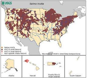 | Keywords: US Range Map of Brown Trout.JPG en Non-indigenous range of Brown Trout in U S Salmo trutta 2014-01-31 09 23 54 http //nas er usgs gov/queries/FactSheet aspx SpeciesID 931 US Geological Survey PD-USGov Uploaded with UploadWizard Salmo trutta |
