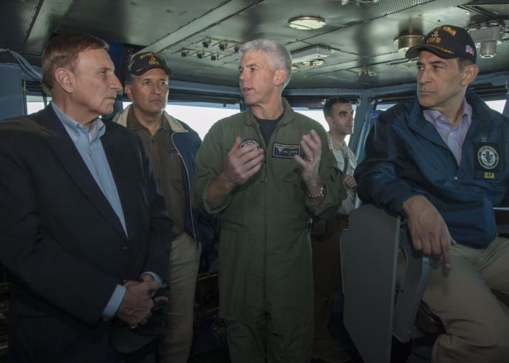 Keywords: US representatives visit USS Carl Vinson 141022-N-UW005-102.jpg en Capt Karl Thomas commanding officer of the Nimitz-class aircraft carrier USS Carl Vinson speaks with U S Representatives John Mica left from Florida Juan Vargas middle and Darrell Issa seated from California on the navigation bridge Carl Vinson and its embarked air wing Carrier Air Wing 17 are deployed in the U S 5th Fleet area of operations supporting Operation Inherent Resolve strike operations in Iraq and Syria as directed maritime security operations and theater security cooperation efforts in the region 2014-10-22 CVN 70 https //www dvidshub net/image/1625195 141022-N-UW005-102 2014-10-22 19 52 USS CARL VINSON AT SEA PD-USGov-Military-Navy USS Carl Vinson CVN-70 Images from DoD uploaded by Fæ |