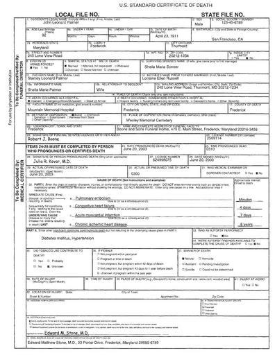Keywords: US Standard Certificate of Death, 2003.jpg certificate of death from the National Center for Health Statistics in the US Centers for Disease Control and Prevention CDC Taken from page 52 59 including introductory materials in http //www cdc gov/nchs/data/misc/hb_cod pdf Physicians' Handbook on Medical Certification of Death Appendix A Page 52 59 United States Centers for Disease Control and Prevention 2003 thumb left Zoomed view of 'cause of death' and 'significant conditions' statements Death certificates Centers for Disease Control and Prevention publications PD-USGov |