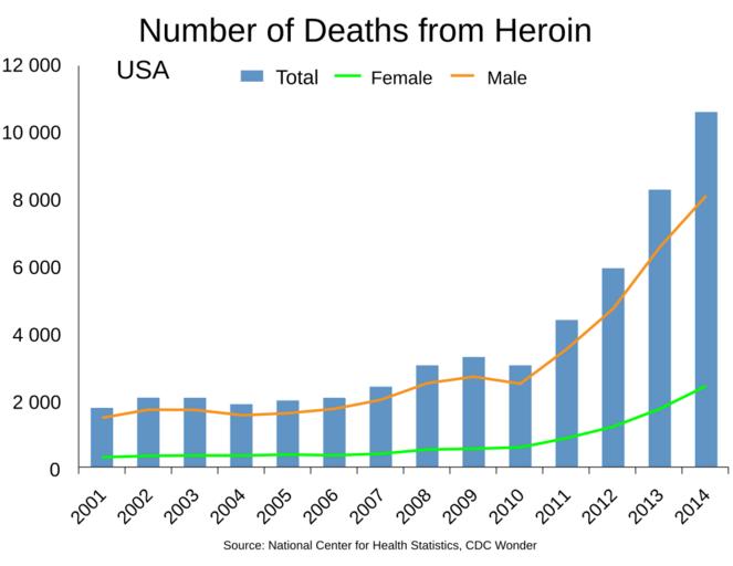 | Keywords: US timeline. Heroin deaths.svg en English National Overdose Deaths ”Number of Deaths from Heroin The figure above is a bar chart showing the total number of U S overdose deaths involving heroin from 2001 to 2014 The chart is overlayed by a line graph showing the number of deaths by females and males From 2001 to 2014 there was a 6-fold increase in the total number of deaths 2016-12-26 - date of creation of the SVG version of the chart My own work based on this https //d14rmgtrwzf5a cloudfront net/sites/default/files/cdc-us-overdose-deaths-2014_jr-5 jpg Chart from http //www drugabuse gov/related-topics/trends-statistics/overdose-death-rates Overdose Death Rates By National Institute on Drug Abuse NIDA SVG derived by me from File US timeline Heroin deaths jpg which was derived from National Institute on Drug Abuse And User Timeshifter User Timeshifter cropped the original chart and added USA to it User Timeshifter put the adapted chart under the same public domain license See Commons Convert tables and charts to wiki code or image files and the section about adding text to chart images other versions PD-USGov Drug-related death statistics |